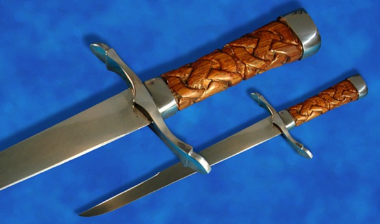 2004-74 'Fantasy' single edged Dagger The 10-5/8 inch long 5160 spring steel blade is 1/4 inch thick at the base and distal tapers slightly along its length. The blade is 1-1/8 inches wide at the base and tapers to approx 3/4 inch near the point. The mild steel guard 5 inches wide and recurves in the plane of the blade. Guard is cusped at the center and has no pronounced quillon block. The grip is 1-1/8 inches wide by 5/8 inch thick at the base and flares to 1-5/16 inch wide by 3/4 inch thick at the butt. There is a 1/2 inch mild-steel bolster at the base of the grip and the conformal mild steel pommel is approx. 3/4 inch long. The 3-11/16 inch long wood section of the handle is Cocobolo wood and is carved with two rows of four-strand celtic knotwork in low relief. The dagger's COG is centered on the guard, and the dagger's weight is 18 oz. The knife is provided with a black leather leather scabbard reinforced at the throat. Though possessing ahistoric features, this is a fully functional medieval-style dagger similar to pieces dating from the 11th-15th centuries. The dagger in this period was designed solely for fighting, and it's thick cross section limits it's utility as a knife. The carving provides an excellent grip without beinh in any way uncomfortable or abrasive. A lovely piece for your collection or as a costume accessory.