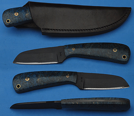 Beautiful knife with blue Box Elder handle, mosaic pins and black blade.
