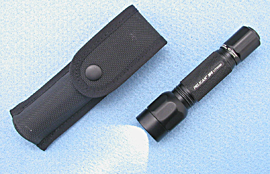 Water resistant. CNC-machined aluminum with a 20,000 candlepower focusable high-pressure Xenon lamp. Constant on/off or momentary tail switch with lock out feature to prevent inadvertent switching. Includes two CR123 lithium cells and belt holster.