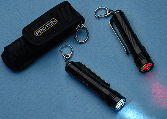 The new Proton packs 6 high output white LEDs (the same found in the new 2X brighter white Photon II & Freedom Micro) into a compact handheld light powered by a single AA battery. A seventh red LED provides an optional low power secondary beam. LRI's popular Freedom(R) digital circuitry provides intuitive one-button access to full-range brightness control and safety strobe functions for both the primary and secondary beam. With over 50 lumens of light ouput at full power*, the Proton is among the brightest single-AA flashlights on the market. A single AA battery will power the Proton for approximately 1.5 hours at full power or up to 250 hours at reduced brightness. *Light output will vary somewhat depending on the type of battery used. Lithium batteries will provide the highest light output, however we recommend rechargeable NiMH batteries for cost-effective frequent use. Features " Intuitive Single Button Operation - Even with gloves. " Smart Circuit o Electronic, instant full power On/Off at any time. o Independent full range brightness control for both White and Red beams. o 4 Safety strobe modes: Slow - Medium - Fast - SOS o Signal / Morse Code mode " Super-bright regulated light output o 250 candle power, 1.4W (White) o 12 candle power, 150 mW (Red) " Easy Battery Replacement - Takes ANY AA size Lithium, NiMH (Nickel Metal Hydride), Alkaline, NiCad or standard Carbon battery (Continual burn times vary depending on the kind of battery used). " Waterproof - Rubber O-rings allow for failproof use in all kinds of foul weather. " Detachable Clip - Easy on. Easy off. Includes filler snap ring when clip not in use. " Built Tough to Survive Serious Daily Use - precision machined aluminum body with Type III hard anodized finish. " Friction ridges for sure grip. Weight: 42.3 grams w/ clip and Lithium AA battery.