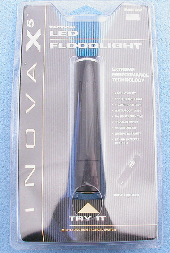 Black anodized body with Blue LED lamps. These are very cool! The LED's use less power than comventional incandescent lamps so the batteries last longer . This is a floodlight type beam as opposed to a pencil beam.