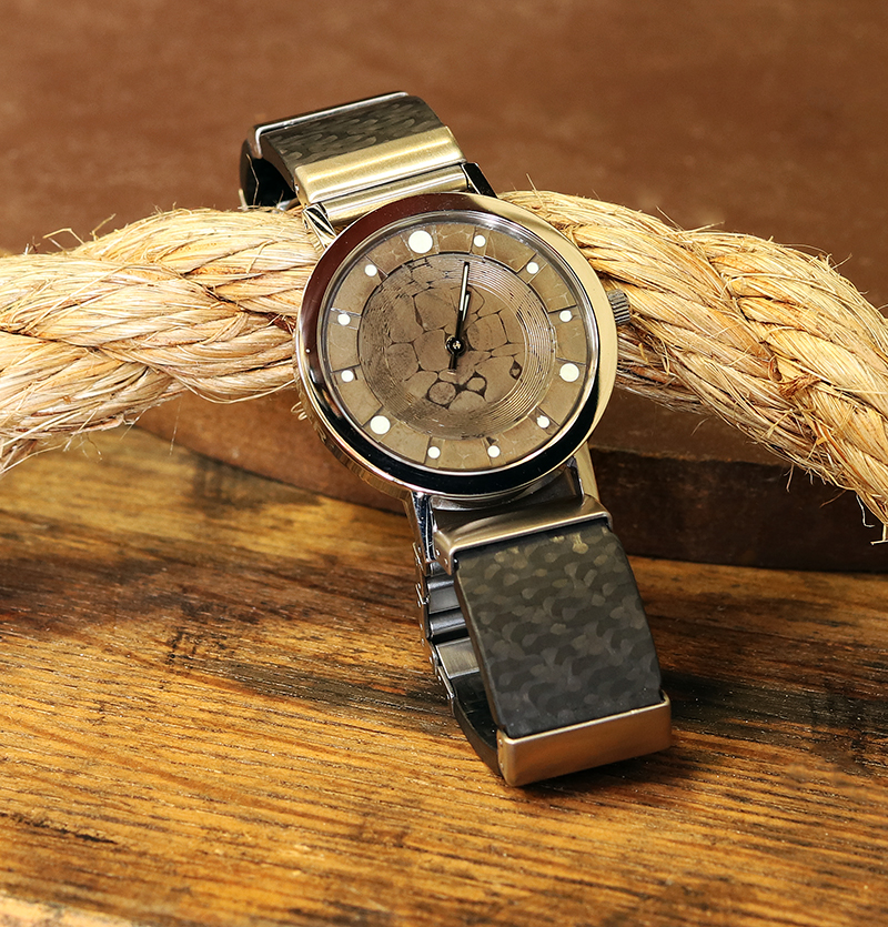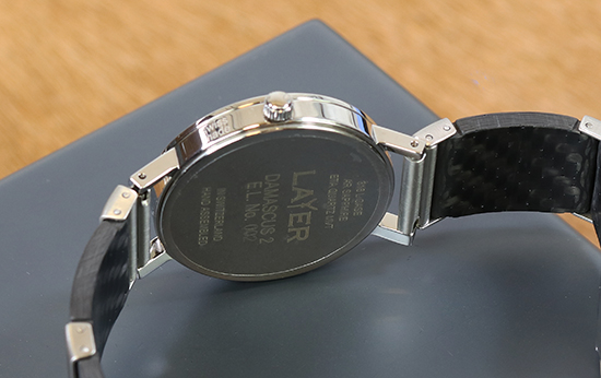 This watch is distinguished by its round index and its Dial made in Hand Forged Stainless Damascus Steel by Chad Nichols.