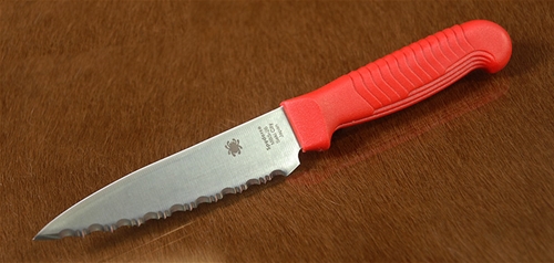 The K05 Utility Knife has a 4.48-inch drop-point blade that offers an excellent balance of control and cutting performance. This makes it incredibly versatile and adaptable to many kitchen cutting chores and utility applications. Like the original version, it features a premium MBS-26 stainless steel blade, ground exceptionally thin and meticulously heat treated for optimal edge retention. Its durable polypropylene plastic handle is injection molded directly onto the tang of the blade and features a distinctive “stepped” texture pattern that provides amazing comfort and control during use.