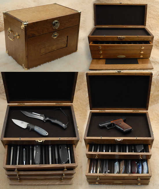 We worked with Gerstner, the finest name in USA made exotic hard wood chests to develop a truly versatile knife, pen, watch and valuables chest. Based on a long discontinued style from Gerstner with a few added extras’ from us, we feel we have developed the ultimate in a small heirloom quatity collector chest. Made from Oak with solid hard woods and brass fittings, Blade Art's KCC chest is perfect to display and mobile enough to move with you. Each chest ships with one felt covered folder/pen insert with additional inserts are available as a $25.00 option. Room enough for 40 folders or pen, numerous watches and or small FB’s… Overall Dimensions: 9 5/8"H x 13 7/8"W x 8Oak hardwood 11/16"D Top Well: 2"H x 12 7/8"W x 7 3/4"D Drawers: All 3 drawers have the same dimensions: 12 1/6"W x 1 7/16"H x 6 1/4"D Weight 13 Lbs