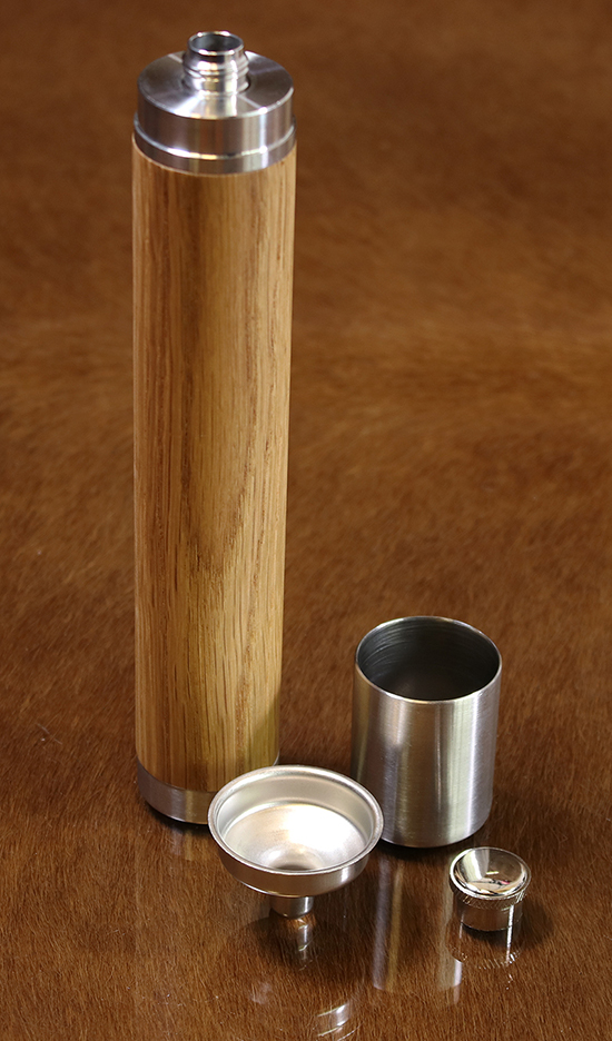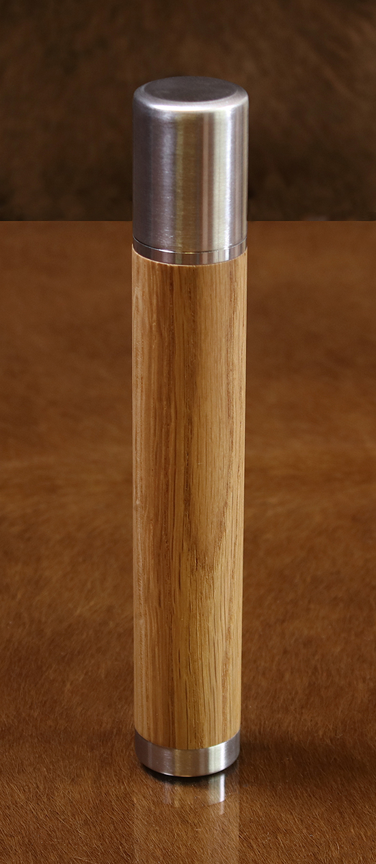 Elegant Flask. Completely handmade from top to bottom. Designed to carry your drink on the go. Beautifully crafted in wood and stainless steel in a cylindrical form. Made to last a lifetime, timelessly elegant.