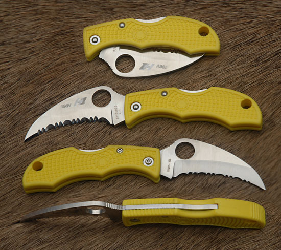 Similar to an extended cat's claw the hawkbill blade wraps around what you're cutting, functionally drawing the cut object in closer and in continuous contact with the sharp edge while the curved hook restrains material from sliding off/away from the blade. The H-1 hollow ground blade is a SpyderEdge configuration.