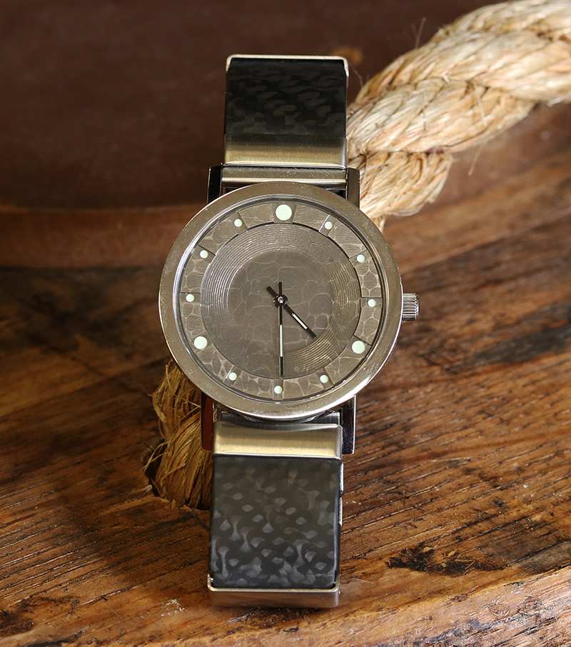 This watch is distinguished by its round index and its Dial made in Hand Forged Stainless Damascus Steel by Chad Nichols.